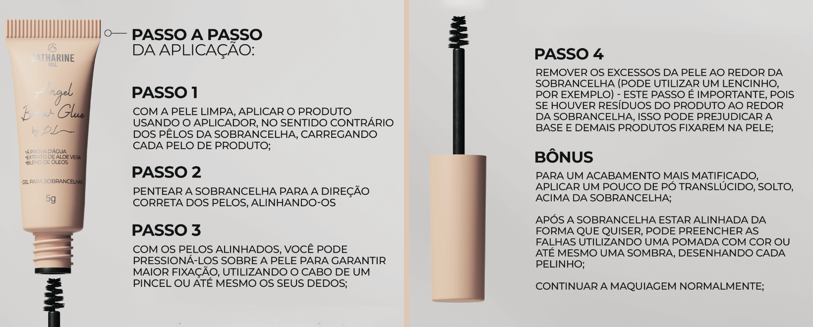 Aplicar a Angel Brow Glue sobre as sobrancelhas com o próprio aplicador, modelando até obter o resultado desejado.