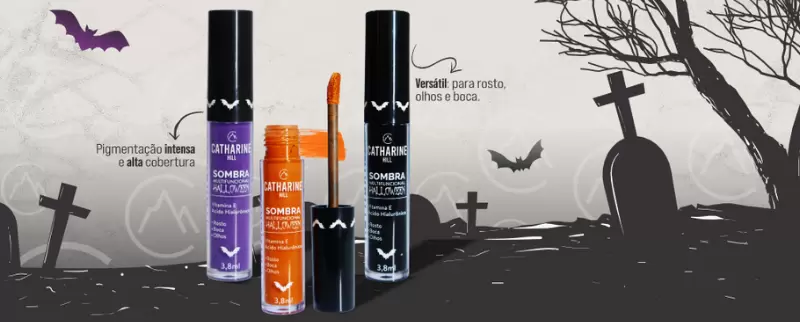 As sombras líquidas multifuncionais da Catharine Hill, foram planejadas para deixar seu Halloween muito mais divertido e impactante. A coleção conta com 3 cores que são coringas nessa ocasião, permitindo que seja produzido desde look mais sociais até artísticos, suas cores são: Salem (preto), Witch (roxo) e Jack (laranja).